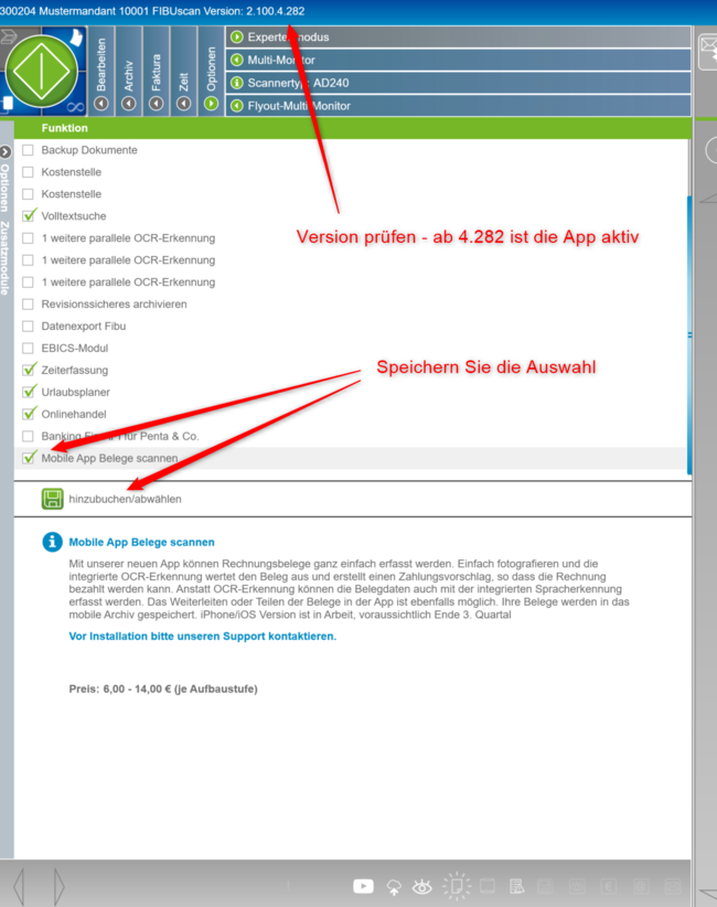 1. Prüfen Sie ob Sie die aktuelle Stable Version von FIBUscan installiert haben: ab Version 2.100.4.282