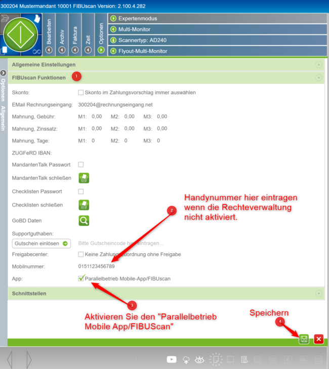 Tragen Sie Ihre Handynummer in das Feld (2), aktivieren Sie die Funktion "Parallelbetrieb Mobile-App/FIBUscan" (3) und speichern (4) Sie die Einstellungen.