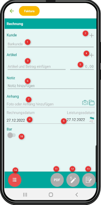 Mit dem PDF-Button (11) können Sie die bisher erstellte Rechnung anschauen. Beim tippen auf den PDF-Button wird ein Entwurf der Rechnung erstellt.