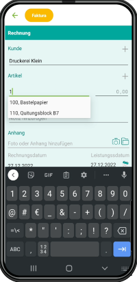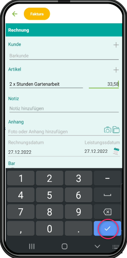 Den Betrag eingeben und mit einem Tipp auf das Häckchen wird der Eintrag gespeichert und Sie können weitere Artikel für die Rechnung erfassen.