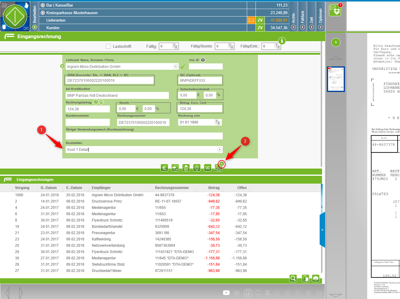 Nach erfolgter Erfassung des Überweisungsträgers der eingescannten Rechnung, haben Sie die Möglichkeit, eine Kostenstellen zuzuordnen. Hierzu wählen Sie die gewünschte Kostenstelle im Auswahlfenster (1) aus. Beim Speichern über das Diskettensymbol (2) wird der gesamte Rechnungsbetrag automatisch der ausgewählten Kostenstelle zugeordnet.