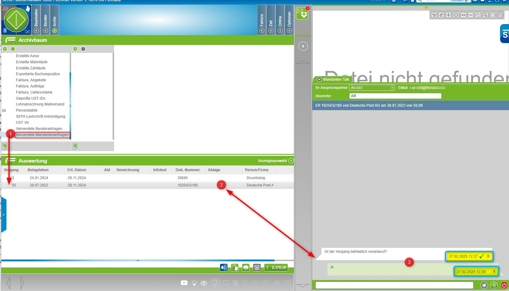 Ihr Steuerberater kann während der Kontierung Ihrer gescannten Belege direkt aus FBUscan Fragen stellen.