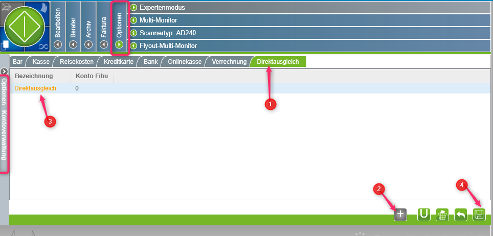 (1) Als erstes richten Sie unter Optionen / Kontoverwaltung / Direktausgleich den Belegkreis ein,