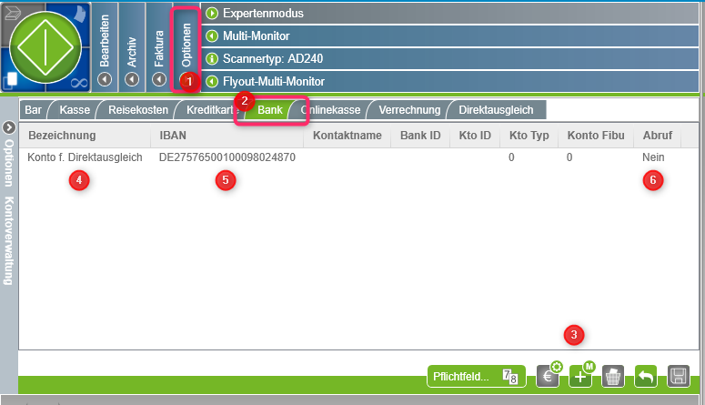 Richten Sie unter Optionen / Kontoverwaltung / Bank (2) ein Konto ein, in dem Sie auf das "M"-Symbol (3) oberhalb des "+"-Buttons klicken.