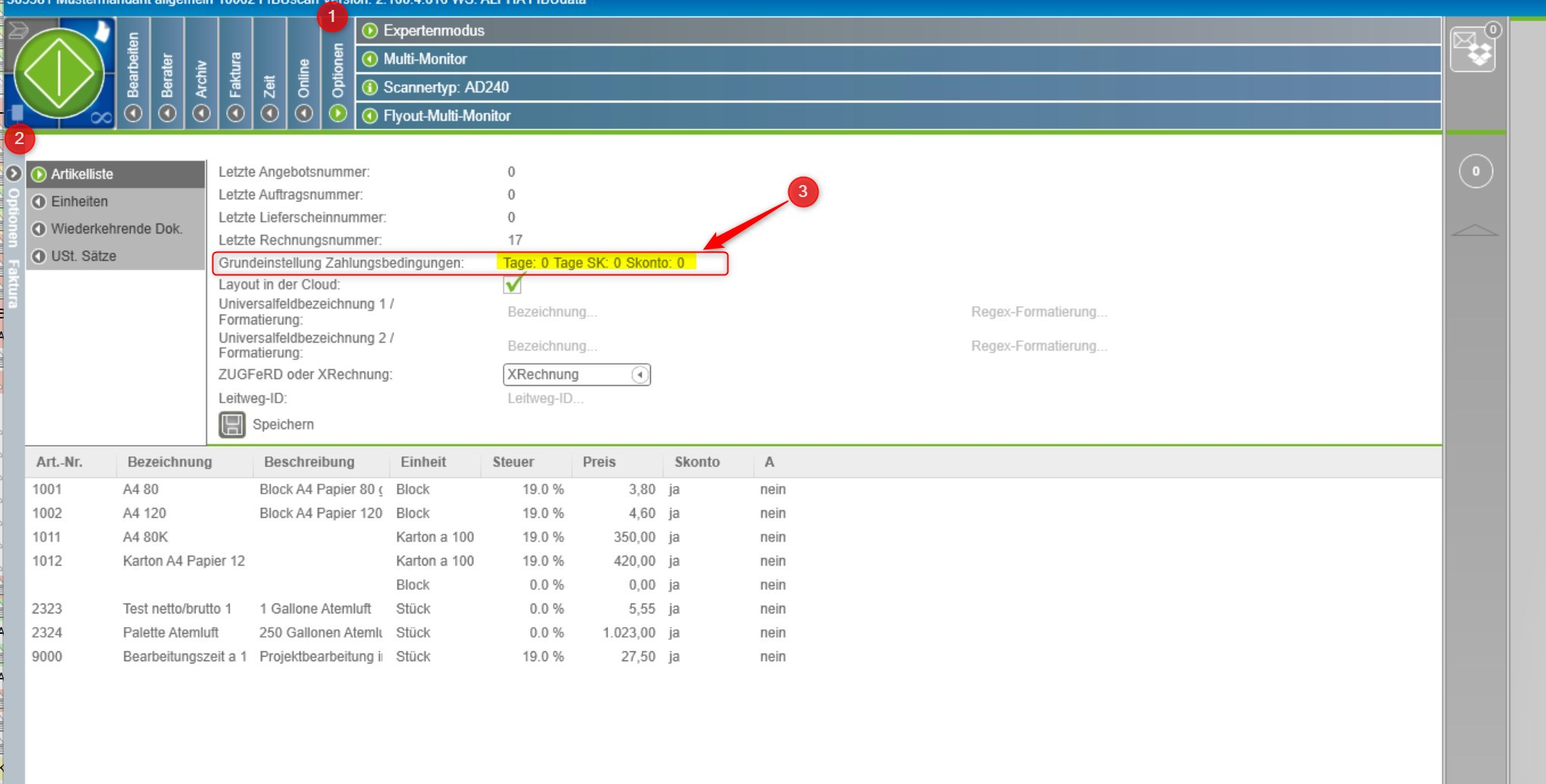Werden beim Import von Kundenstammdaten Merkmale der Zahlungsbedingungen (Zahlziele, Skonto) pauschal vorbelegt, prüfen Sie bitte die Einstellungen in der Faktura. Die Grundeinstellung Skonto wird dort für die Rechnungserstellung per FIBUscan für alle Kunden vorbelegt, aber auch für die neu anzulegenden Kundenstammdatensätze übernommen.