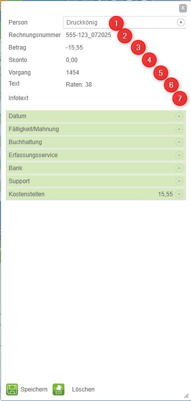 Im Feld Buchhaltung erscheinen Daten erst, wenn der Datensatz an das Finanzbuchhaltungsprogramm exportiert wurde.