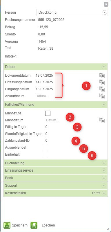 (1) Im Feld Datum lässt sich nachfolgend nur das Dokumentendatum ändern/korrigieren, sofern es bei Erfassung falsch eingetragen wurde.