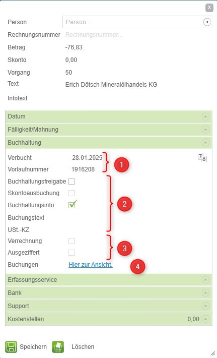 (3) Hier lässt sich nachvollziehen, wie der Beleg zahlungstechnisch ausgeglichen wurde.
