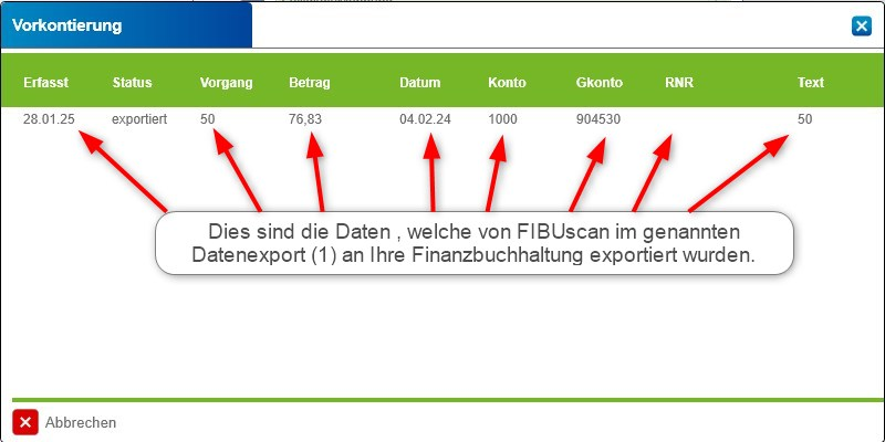 (1) Mit diesen Einträgen können Sie nachvollziehen wann der Datensatz exportiert wurde und frühestens in der Finanzbuchhaltung vorlag, und mit der Vorlaufnummer kann im Exporttool des Beraterbereiches der Exportstapel gesucht und überprüft werden.