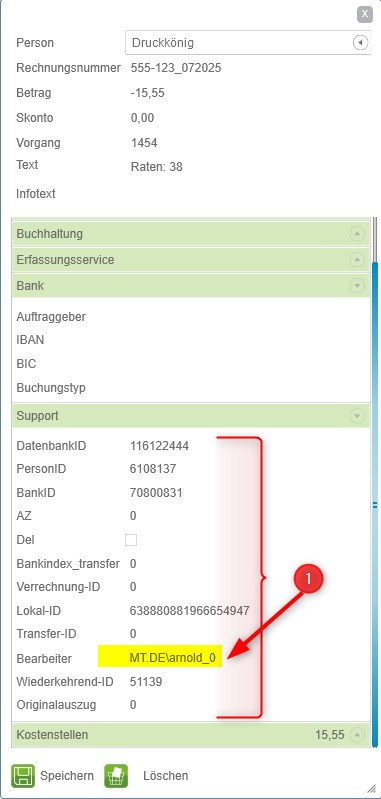 In den Supportdaten werden Daten angezeigt, die bei Erstellung und Bearbeitung des Datensatzes entstehen und nicht änderbar sind. Diese Daten sind notwendig die GoBD Sicherheit des Programmes zu gewährleisten.