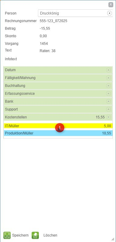In der Anzeige der Kostenstellen sehen Sie übersichtlich, welche Beträge/Teilbeträge des Beleges welcher Kostenstelle zugeordnet wurden. Änderungen/Korrekturen nehmen Sie bitte wie