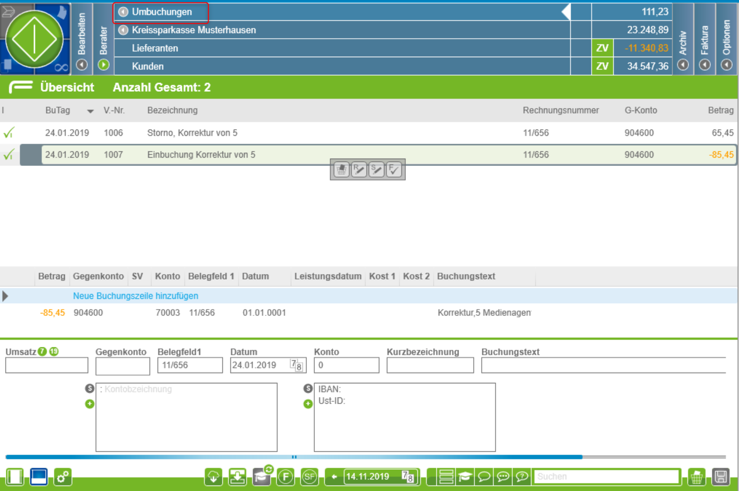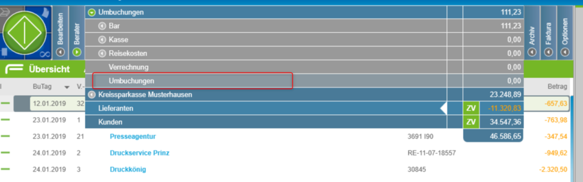 2. Sollten Sie die Kontierung durchgeführt und die Postionen exportiert haben, werden die Änderungen bzw. gelöschten Positionen im Belegkreis "Umbuchungen" gespeichert.