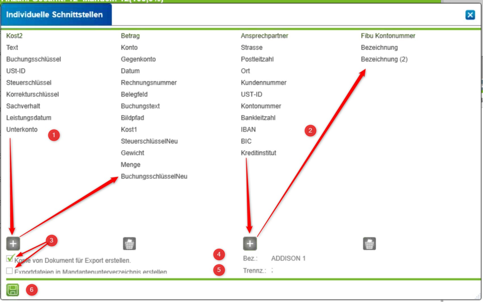 - Für die Stammdaten (2) ist das Feld Bezeichnung 2x auszuwählen da dieses Feld in Hannibal 2x benötigt wird, für die Anlage der Personenkonten und der Adressdaten.