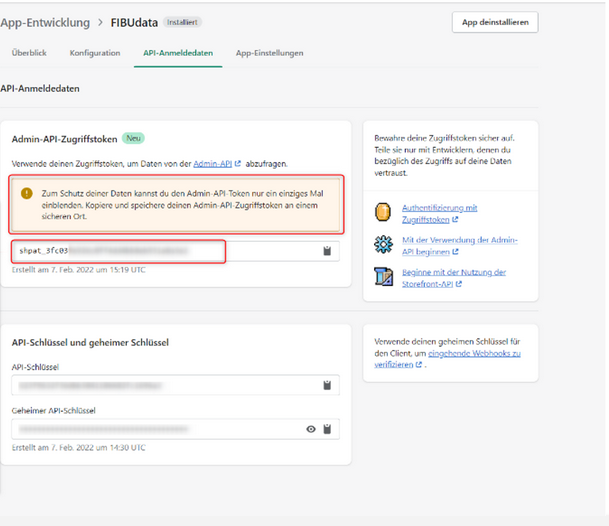 Wichtiger Hinweis: Admin-API-Zugriffstoken können nicht nachträglich auf Shopify angezeigt werden. Daher markiere diese mit Deiner Maus und kopiere sie Dir in eine geeignete Textdatei auf Deinem Server.