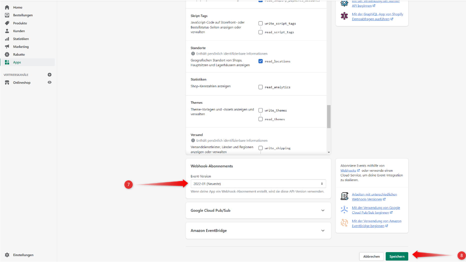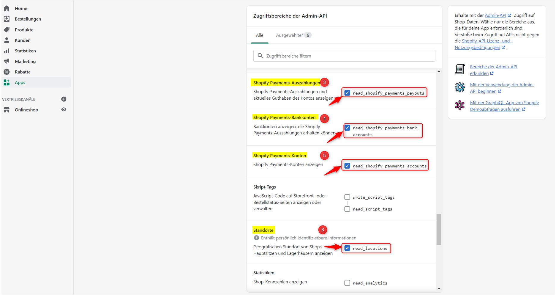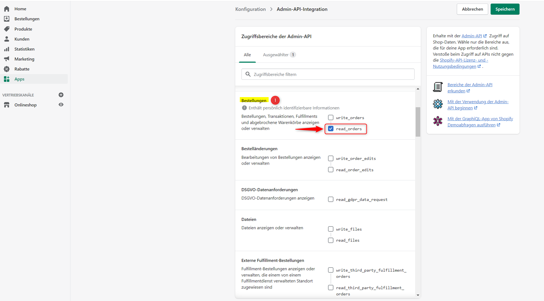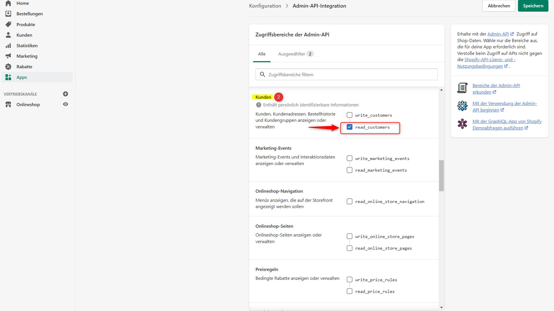 * Sie müssen in den Einstellungen von Ihrem Shop die Zugriffsrechte "read _***" freigeben für