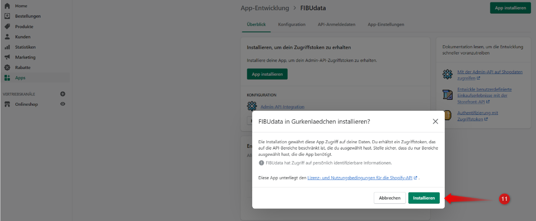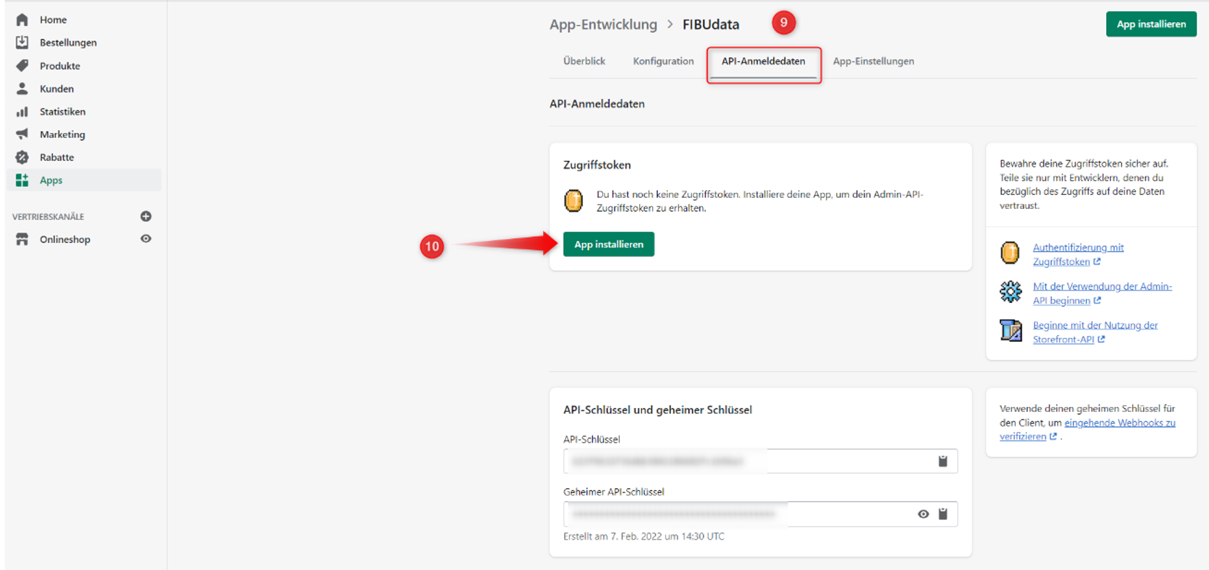 Schritt 9-10: Klicken Sie auf die "API-Anmeldedaten" und dann auf den Button "App installieren".